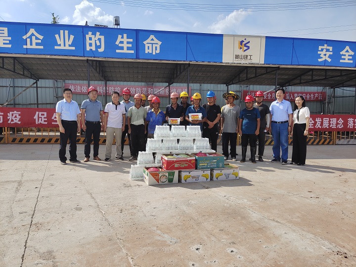 在黃山市南部城鎮(zhèn)群水務(wù)調(diào)度中心項(xiàng)目、黃山生豬定點(diǎn)屠宰加工及配套設(shè)施項(xiàng)目及配套冷鏈項(xiàng)目施工現(xiàn)場(chǎng),城投集團(tuán)總裁黃世穩(wěn)、黨委副書記汪蓉、副總裁朱愛民等一行將慰問品送到一線職工手中,并和大家親切交談,細(xì)致了解大家的生活工作情況,總裁黃世穩(wěn)叮囑要注意勞逸結(jié)合,合理安排作息時(shí)間,做好防暑降溫工作,確保實(shí)現(xiàn)安全生產(chǎn)。