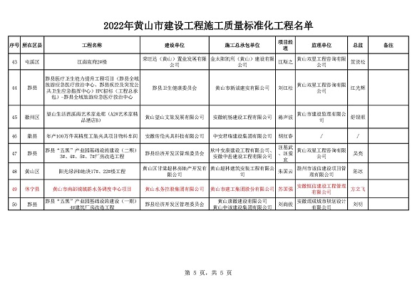 黃山市建工集團(tuán)股份有限公司承建的徽州家園項(xiàng)目、歙縣人民醫(yī)院醫(yī)療能力提升項(xiàng)目、黃山橫江灣凱悅酒店項(xiàng)目、高鐵黟縣東站站前廣場及附屬配套工程、黃山市南部城鎮(zhèn)群水務(wù)調(diào)度中心項(xiàng)目、黃山北海路公交綜合大樓工程榮獲2022年施工質(zhì)量標(biāo)準(zhǔn)化工程和安全生產(chǎn)標(biāo)準(zhǔn)化工地的殊榮。