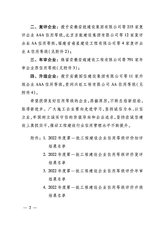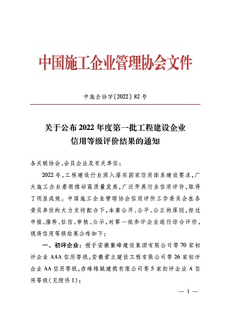 2022年,黃山市建工集團(tuán)股份有限公司再次榮獲施工企業(yè)最高信用評級“AAA級企業(yè)信用證書”。這是對黃山市建工集團(tuán)股份有限公司持續(xù)積累的經(jīng)營管理能力、合同履約能力、市場競爭能力及優(yōu)質(zhì)社會形象的權(quán)威認(rèn)證。