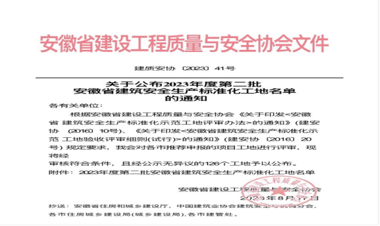 8月17日,安徽省建設(shè)工程質(zhì)量與安全協(xié)會發(fā)布2023年度第二批安徽省建筑安全生產(chǎn)標準化工地名單,黃山建工集團仙人洞南路東側(cè)D1地塊(文瀾軒)項目獲評“安徽省建筑安全生產(chǎn)標準化工地”。