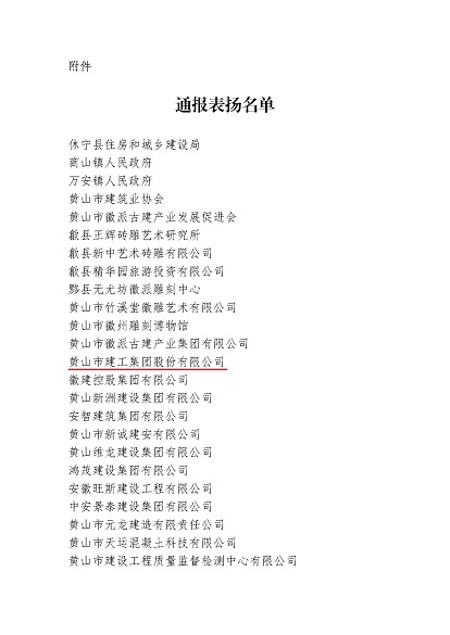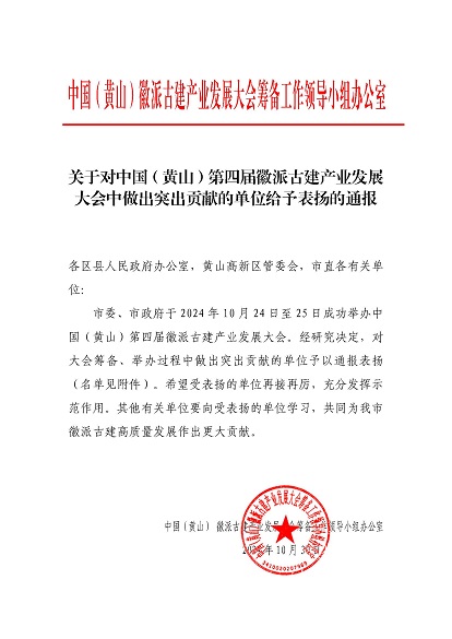 市委、市政府于2024年10月24日至25日成功舉辦中國(黃山)第四屆徽派古建產(chǎn)業(yè)發(fā)展大會。近日,中國(黃山)徽派古建產(chǎn)業(yè)發(fā)展大會籌備工作領(lǐng)導(dǎo)小組辦公室發(fā)布《關(guān)于對中國(黃山)第四屆徽派古建產(chǎn)業(yè)發(fā)展大會中做出突出貢獻的單位給予表揚的通報》,黃山建工集團榮列其中。